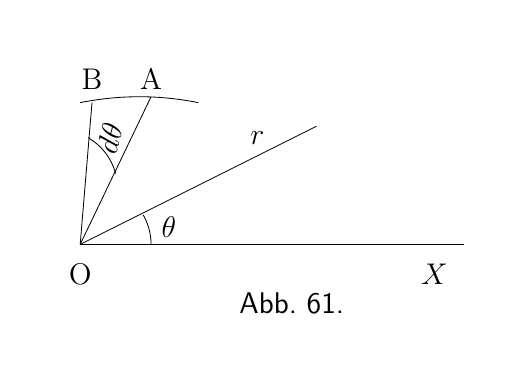 Anstelle eines Flächenstreifens betrachten wir ein kleines Dreieck OAB, wobei der Winkel an O $d\theta$ ist, und wir finden die Summe aller kleinen Dreiecke, die die erforderliche Fläche bilden.