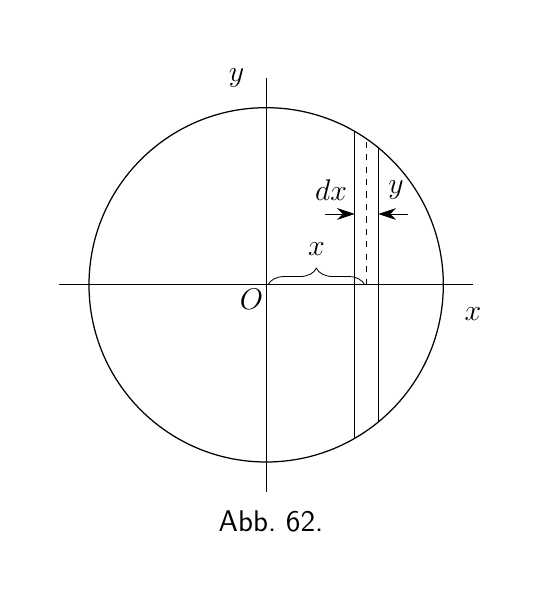 Wir können auch folgendermaßen vorgehen: Eine Scheibe der Kugel, mit der Dicke dx, hat ein Volumen von $\pi y^2\, dx$ (siehe Abbildung 62).