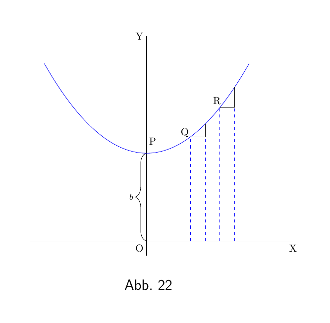 Dies zeigt, dass die Steilheit nicht konstant ist: Sie nimmt mit steigendem x zu. Am Startpunkt P, wo $x = 0$, hat die Kurve (Abbildung 22) keine Steilheit, d.h. sie ist eben. Links vom Ursprung, wo x negative Werte hat, wird $\dfrac{dy}{dx}$ ebenfalls negative Werte haben oder von links nach rechts absteigen, wie in der Abbildung.